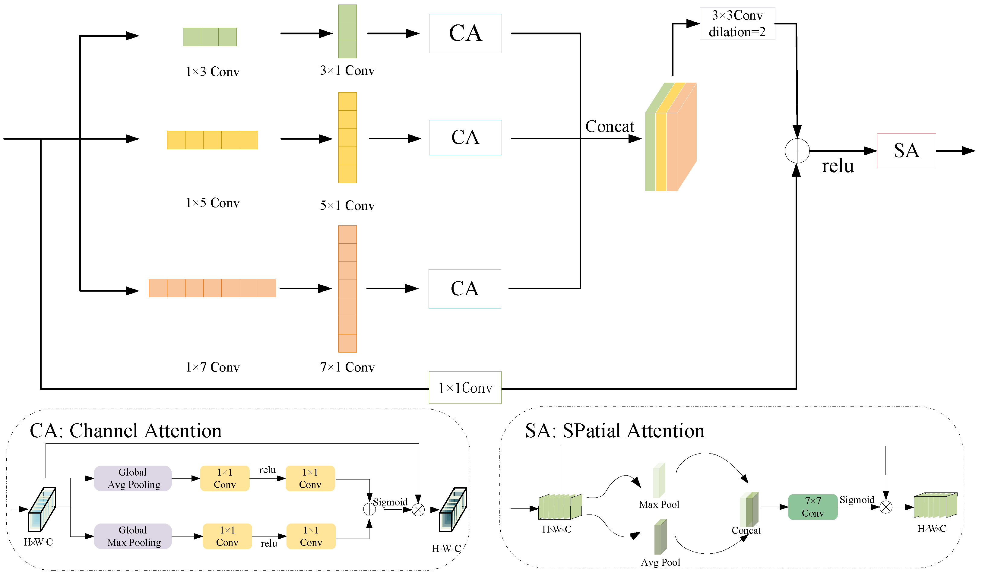 Figure 3. This module strengthens spatial context, extracts multi-scale features, and highlights key elements. Consequently, it improves the model’s ability to detect target boundaries and manage targets at various scales, boosting overall performance. The features from all three branches are concatenated and subsequently processed using depthwise separable convolution (dilation = 2), which restores channel capacity while broadening the effective receptive area, thereby improving the model’s grasp of both local context and overall scene structure.