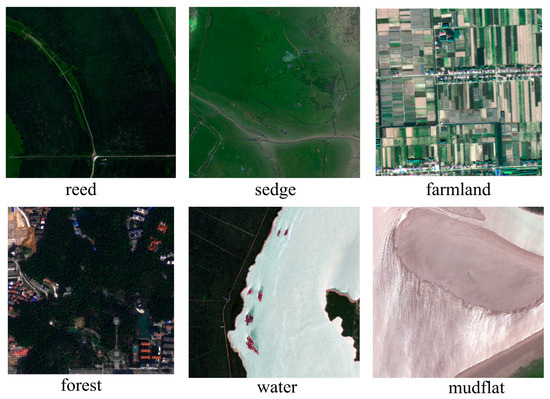 Based on geomorphological characteristics, six primary land cover types were identified in Dongting Lake wetlands: reeds, water, sedges, mudflats, farmland, and forests (Figure 2). To ensure the deep learning model had a robust and diverse training dataset, additional imagery from areas surrounding Dongting Lake was selected for annotation. eCognition9.0, a powerful remote sensing image analysis tool, was utilized in the annotation process, which enabled efficient and precise labeling of large-scale datasets. The visual interpretation results were incorporated into the process, and manual corrections were conducted to ensure the accuracy and quality of the annotations. These meticulously prepared samples provided a solid foundation for model training and validation, ensuring reliable classification outcomes.