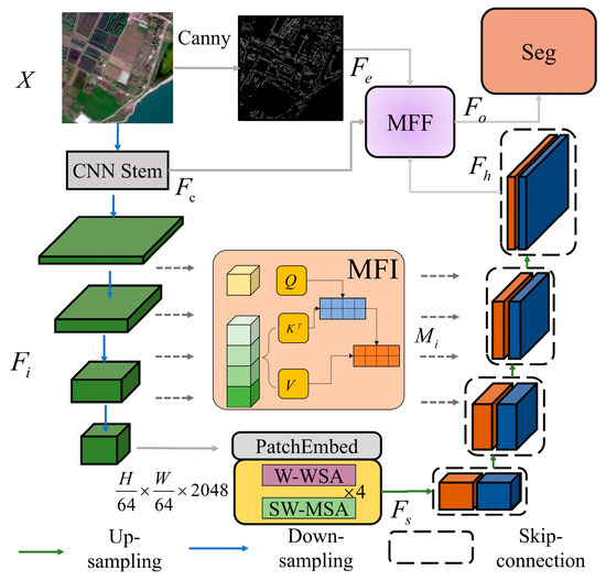 The contributions of the study are as follows: (1) A hybrid encoder combining Swin Transformer and ResNet enhances global context-awareness capability and local feature capturing. (2) The Multi-Scale Feature Interaction (MFI) module achieves effective multi-level feature fusion and reduces the semantic gaps in jump connections. (3) The edge features are integrated via the Multi-Feature Fusion (MFF) module to improve the classification accuracy. The proposed model is validated on wetland images from Dongting Lake.