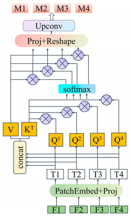 In WetSegNet, in order to optimize the skip connection in UNet and solve the semantic gap problem in the process of feature fusion, we developed a Multi-Scale Feature Interaction (MFI) module (Figure 7), which employs a cross-attention mechanism [18] to achieve information interaction between features of different scales. This strategy not only compensates for the deficiencies of UNet in capturing the global context, but also significantly improves the performance and classification accuracy of the model. The MFI module adopts a hierarchical multi-head cross-attention design, with the number of attention heads set to [3,6,12,24] across the four stages. The query, key, and value vectors are initialized with a dimension of 96, and layer normalization is applied before attention operations to stabilize training.