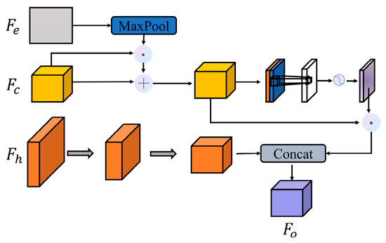 In the encoder part of the model, the original image is processed in grayscale, and the Canny operator is used to generate the binarized edge map . At the same time, convolution and normalization operations are used to extract the low-level features that contain rich detail information. In order to align the spatial resolution of with , it is down-sampled using maximum pooling, and the down-sampled edge map is multiplied element by element with and then added to to obtain the new feature :