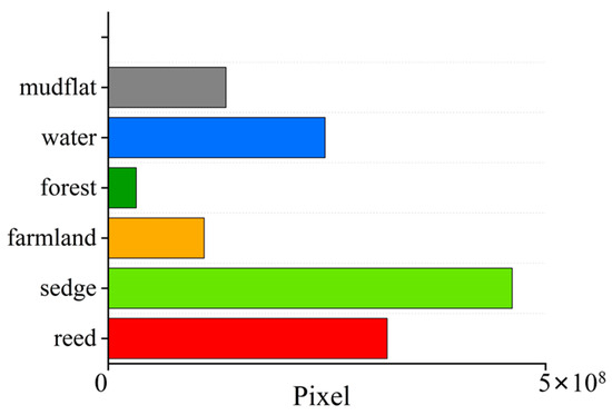 Distribution of pixel counts across six wetland categories in the Dongting Lake dataset, highlighting class imbalance between dominant (sedges, reeds) and less dominant (farmland, forests) types.