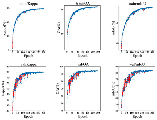 In this study, we used the overall accuracy (OA), kappa coefficient (Kappa), and mean intersection over union ratio (mIoU) as metrics to assess the model performance. These metrics were evaluated based on the four basic elements of the confusion matrix: true positives (TPs), false positives (FPs), true negatives (TNs) and false negatives (FNs). Each evaluation metric was calculated as follows: