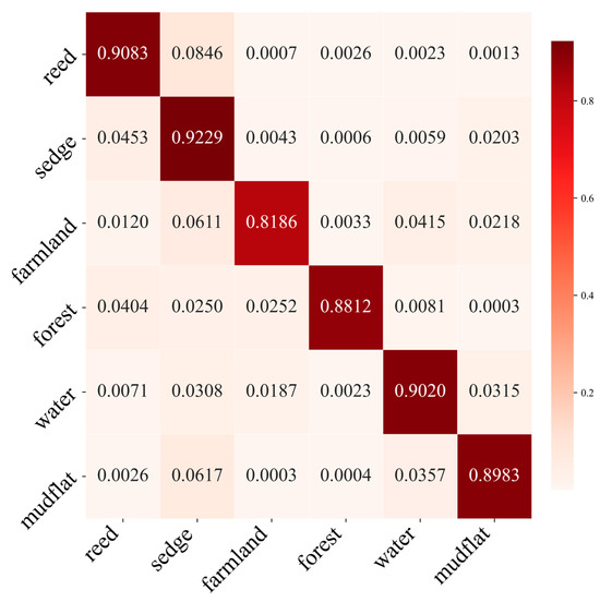 From the confusion matrix of the test set (Figure 11), it was found that most categories (e.g., reeds, forests, and water) had high classification accuracies along the diagonal; however, there was confusion between some categories, such as reeds and sedges and sedges and farmland, which may be due to the similarity in their spectral properties or spatial distributions. Mudflats in particular were confused with other categories (e.g., water and farmland), despite the high overall classification accuracy.