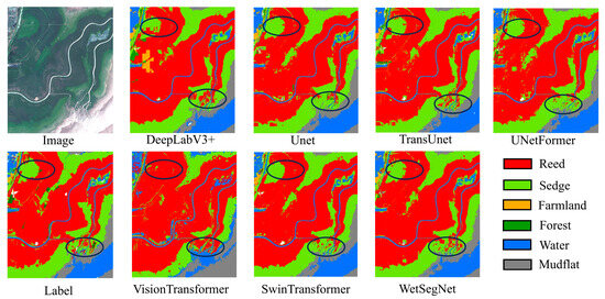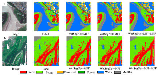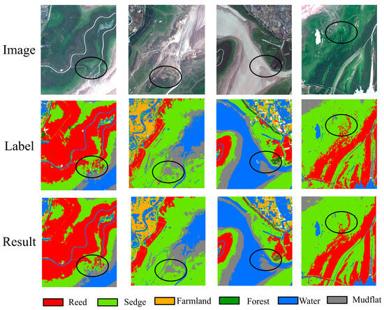 Figure 12 shows the mapping results of WetSegNet in four GF-2 images. WetSegNet shows a high accuracy in wetland classification at Dongting Lake, with few misclassifications and smooth and coherent classification results. The patch effect in the labels is also avoided; for example, some labels in the first column were incorrectly shown as forests instead of reeds, but the model accurately identified the true distribution of forests. The classification boundary at the end of the watershed was also clear and natural, with no scattered misclassifications in the labels. Similarly, the sedge–mudflat junction in the second column exhibits a fragmented and blurred distribution due to inaccurate labeling, but WetSegNet accurately segmented both wetland types. The mudflat area in the third column is particularly evident, and WetSegNet was able to accurately identify and classify it more accurately than when labeled using the original image. Overall, WetSegNet achieves accurate classification of different wetlands through multi-scale feature extraction and effective guidance of edge information. It also exhibits smooth spatial transitions and the ability to correct labeling errors, while the classification results are more complete.