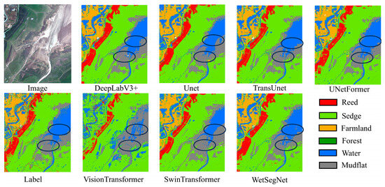 To verify the superiority of the WetSegNet model proposed in this study on the wetland dataset, we compared it with six models (UNet [16], DeepLabv3+ [40], Vision Transformer [41], Swin Transformer [27], TransUNet [42] and UNetFormer [43]). Table 2 shows that the overall accuracy (OA) of the WetSegNet model reaches 90.81%, the mIoU is 82.91%, and the Kappa coefficient reaches 0.88, which demonstrate improvements of 3.3%, 5.90%, and 0.05 compared with the baseline model UNet, respectively.