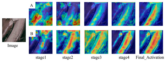 WetSegNet, which includes the MFI module, exhibits clearer and more accurate feature representation in each stage (stage1 to stage4) and a better final activation result (Last_class_activate) compared with no_MFI (Figure 15). Specifically, WetSegNet is able to effectively capture boundary details and multi-scale information at different stages, and high-response regions in the feature map are more concentrated in the target region, with less noise and smoother boundary transitions compared with no_MFI. In contrast, in the no_MFI model, the high-response areas of the feature maps in each stage are more scattered and the target boundary is blurred, which indicates that its ability to interact and integrate multi-scale features is insufficient. The MFI module effectively enhances the model’s perception of the target area by interacting and integrating features of different scales, which improves the accuracy of wetland classification.