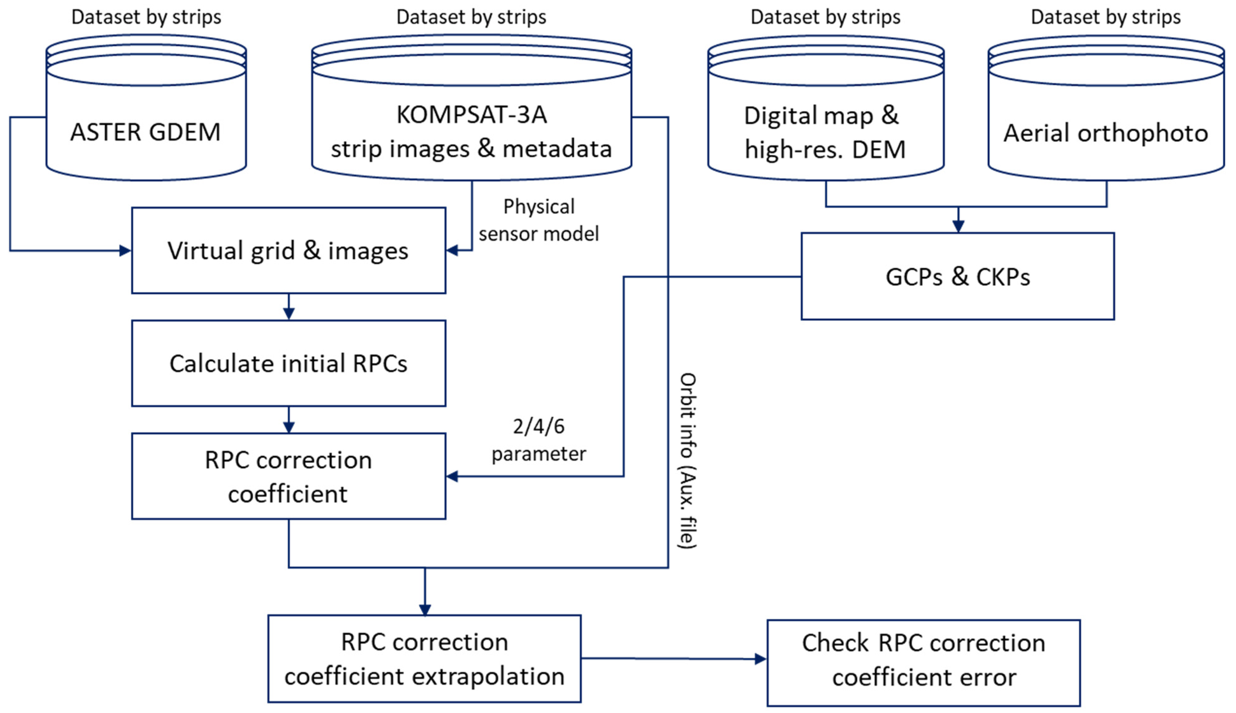 - Kim, N.; Choi, Y.; Bae, J.; Sohn, H.-G. Estimation and Improvement in the Geolocation Accuracy of Rational Polynomial Coefficients with Minimum GCPs Using KOMPSAT-3A. GISci. Remote Sens. 2020, 57, 719–734. [Google Scholar] [CrossRef]
