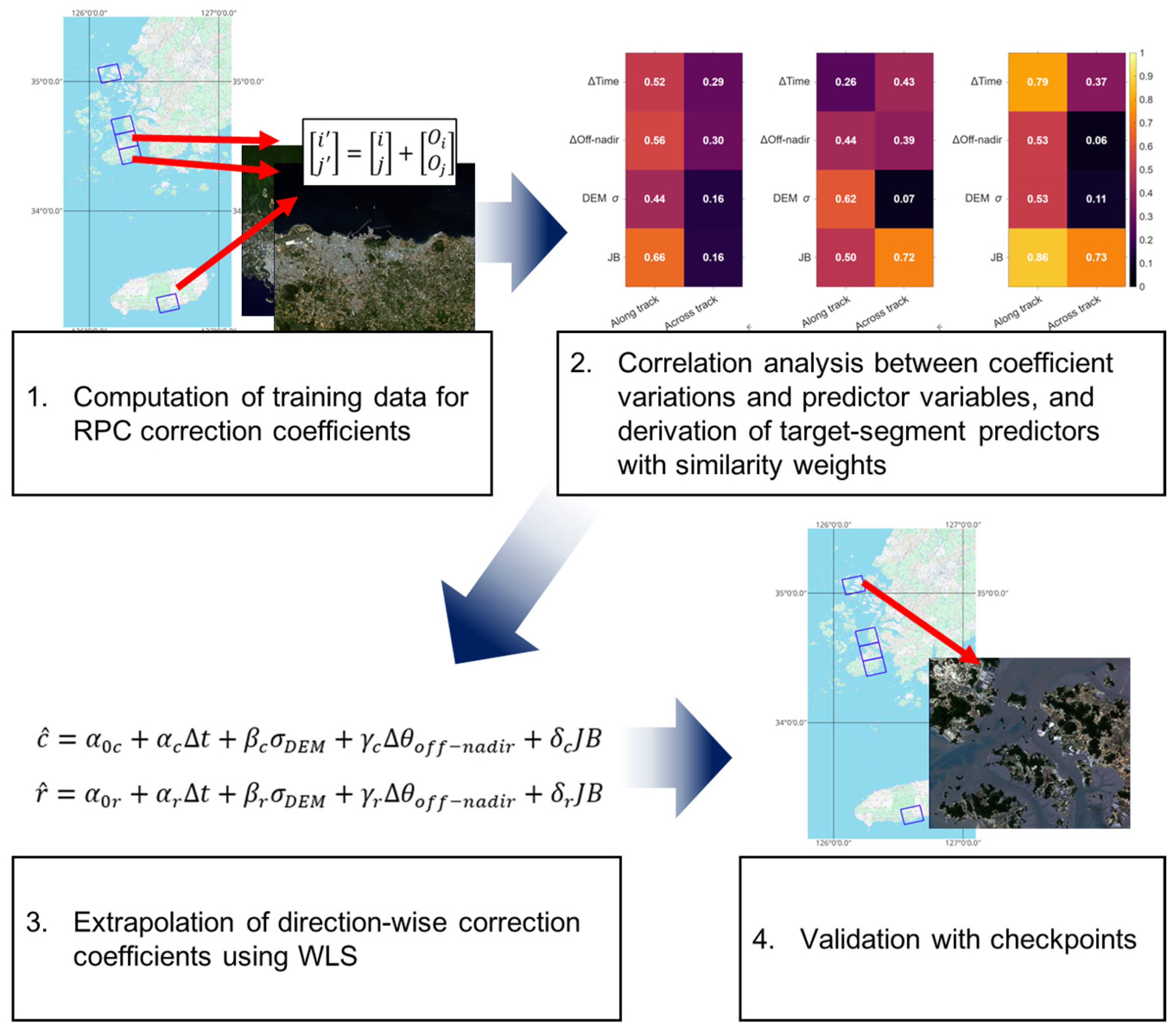 - Strip segment RPC correction coefficient extrapolation that preserves native scene geometry and reduces GCP dependence. The method calibrates on a small upstream subset and transports correction coefficients to downstream segments, providing a practical alternative to strip-wide block adjustment in control-denied or resource-constrained settings.