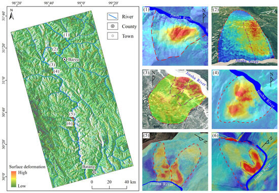 Surface deformation monitoring and deformation characteristics of typical landslides in the Baiyu–Batang section of the upper Jinsha River. Red represents areas with significant surface deformation, whereas green and blue represent areas with minimal surface deformation. (1) Woda landslide, (2) Shadingmai landslide, (3) Guili landslide, (4) Xiaomojiu landslide, (5) Xiongba landslide, (6) Sela landslide. The red dotted line indicates the boundary of the landslide.