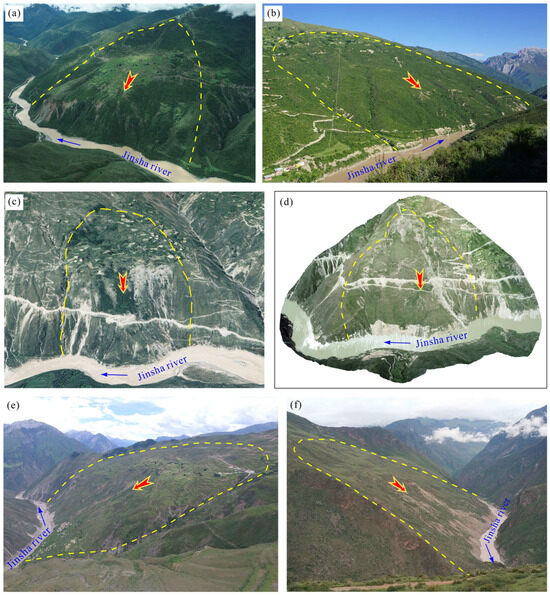 Development characteristics of typical active landslides in the Baiyu–Batang section of the upper Jinsha River. (a) Woda landslide (photo, mirror 225°), (b) Shadingmai landslide (photo, mirror 275°), (c) Guili landslide (Google image, mirror 215°), (d) Xiaomojiu landslide (UAV image, mirror 235°), (e) Xiongba landslide (photo, mirror 140°), (f) Sela landslide (photo, mirror 20°). The yellow dotted line indicates the boundary of the landslide, and the red arrow indicates the sliding direction of the landslide.