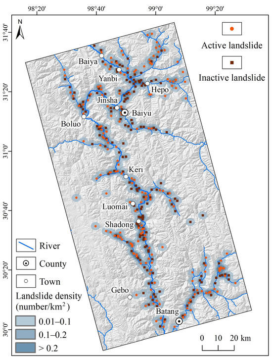 Landslide spatial distribution characteristics in the Baiyu–Batang section of the upper Jinsha River. The search range for landslide density calculation is 3 km.