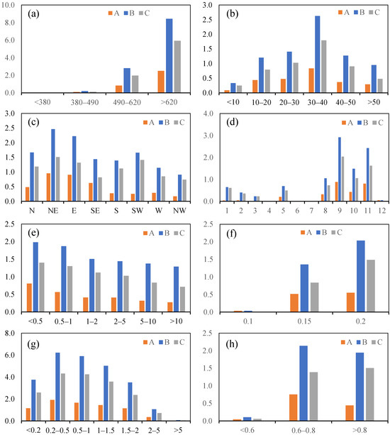 Statistical analysis of landslide distribution characteristics. (a) Topographic relief (m/km2), (b) Slope gradient (°), (c) Slope aspect, (d) Engineering geological unit (the classification number is presented in Figure 6d), (e) Distance to fault (km), (f) PGA, (g) Distance to river (km), (h) NDVI. The horizontal axis of the histogram represents the factor grade intervals, and the vertical axis represents the landslide density (km2/10 km2). In the legend, A indicates Dataset A, B indicates Dataset B, and C indicates Dataset C.