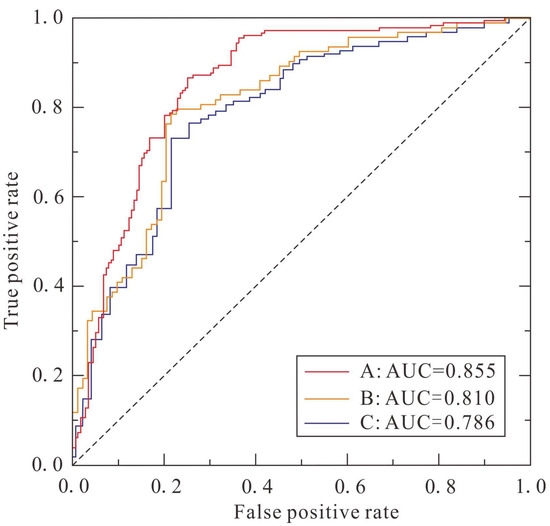 ROC curve of landslide susceptibility results. In the legend, A indicates Dataset A, B indicates Dataset B, and C indicates Dataset C.