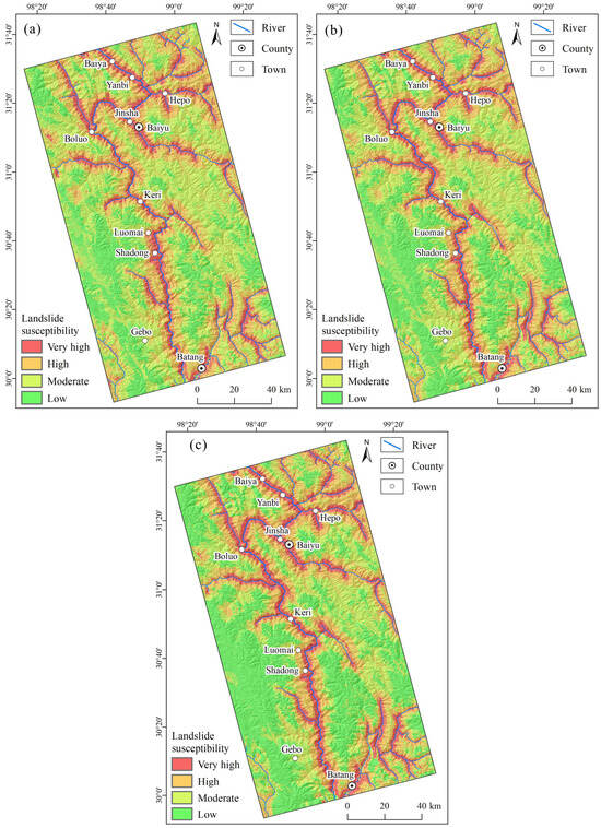Landslide susceptibility distribution in the Baiyu–Batang section of the upper Jinsha River. (a) Landslide susceptibility result based on Dataset A (active landslide), (b) Landslide susceptibility result based on Dataset B (active and inactive landslide), (c) Landslide susceptibility result based on Dataset C (inactive landslide).