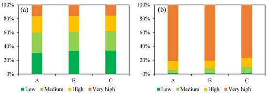 Statistical charts of landslide susceptibility distribution. (a) Statistical area proportion of landslide susceptibility zones, (b) Statistical landslide proportion corresponding to landslide susceptibility zones. A indicates Dataset A, B indicates Dataset B, and C indicates Dataset C.