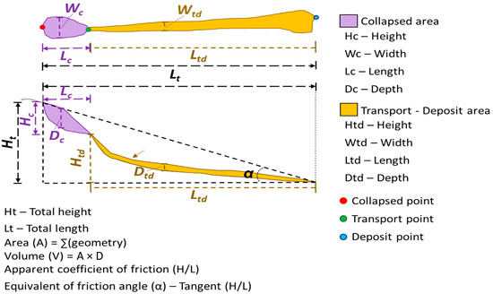 Diagram illustrating the main morphometric parameters used to characterize landslide geometry across collapse, transport, and deposition zones.