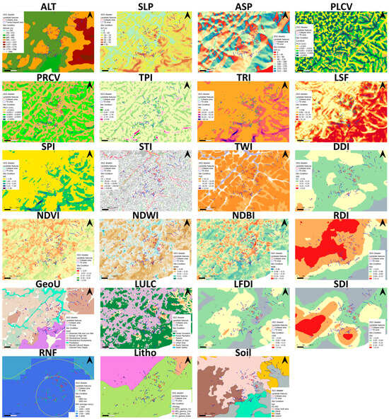 The geospatial data were processed and analyzed in QGIS and SAGA GIS [87]. The DEM was used to calculate widely adopted topographic parameters for landslide modeling. All terrain derivatives were computed for each 30 × 30 m grid cell, corresponding to the native resolution of the original SRTM dataset (Table 1; Figure 3). Topographic metrics included altitude (ALT), slope angle (SLP), aspect (ASP), plan curvature (PLCV), profile curvature (PRCV), topographic position index (TPI), topographic roughness index (TRI), and the length-slope factor (LSF) [78,81,88,89,90]. We also calculated topographic characteristics which have been used as a proxy of hydrological and sediment transport processes, such as the topographic wetness index (TWI), stream power index (SPI), and sediment transport index (STI) [91].