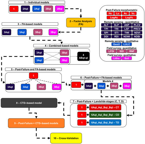 To systematically investigate the controlling factors of site condition parameters on landslide runout distance, we adopted a sequential modeling framework (Figure 4). The research design was structured into three progressive phases, each addressing specific analytical objectives: (i) development of standalone models to evaluate the individual effects of distinct variable sets; (ii) construction of combined models to explore the effects of integrating multiple data sources; and (iii) development of multi-stage models to explore complex interactions across landslide process zones. A total of 218 MLR models were developed based on the complete landslide inventory (n = 171), ensuring a robust empirical basis for performance evaluation. The Model 1 comprised univariate models using post-failure morphometric (PFM) parameters from the collapsed zone, such as height (Hc), length (Lc), width (Wc), area (Ac), volume (Vc), and logarithmic values (LogAc and LogVc) (Figure 4). These variables are widely cited in runout prediction literature [2,19,21,29,104]. Model 2 accessed the individual predictive power of geoenvironmental site-condition variables, considering quantitative and qualitative inputs (Table 2). These were organized by source into remote sensing-based (2A) and field survey-based (2B) data acquisition approaches (Figure 4). Model 2 to 6 were independently developed for the collapse, transport, and deposition points. This approach allowed us to assess the specific influence of site-condition variables at each stage of landslide propagation, recognizing that different factors may control runout [18,32,39].
