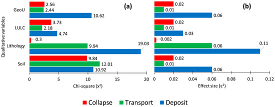 Comparative analysis of categorical predictors across landslide phases. (a) Chi-square (χ2) statistics from Kruskal–Wallis tests, indicating the strength of association between categorical variables and each landslide zone (collapse, transport, deposition); (b) corresponding effect size (ε2), representing the proportion of variability explained by each categorical variable across zones.