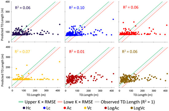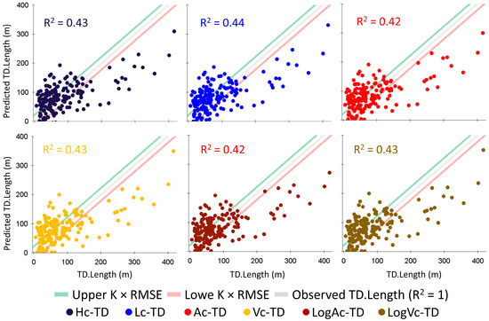 Model 7 type multivariate linear regression models combining post-failure and Transport–Deposit (TD) geoenvironmental variables. Upper and lower (K × RMSE) bounds represent overestimation and underestimation thresholds, respectively (K = 0.30). The TD Length line indicates the 1:1 reference, where predicted values equal observed values under ideal model performance.