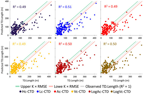 Model 7 type multivariate linear regression models combining post-failure and Collapse–Transport (CT) geoenvironmental variables. Upper and lower (K × RMSE) bounds represent overestimation and underestimation thresholds, respectively (K = 0.30). The TD Length line indicates the 1:1 reference, where predicted values equal observed values under ideal model performance.
