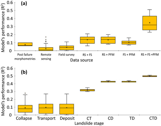 The addition of landslide morphometric parameters (Model 5) marked a moderate improvement compared with Model 3. The highest accuracy was achieved using collapse length (Lc) and environmental descriptors in the collapse and transport zones (R2 = 0.20). In terms of data source, the quantitative variables obtained from remote sensing yielded the strongest performance in the collapse and transport zones (R2 = 0.16–0.20). The model that used data from multiple data groups for site condition variables and landslide morphometric parameter (Model 6) reinforced and the highest R2 was 0.28 (Appendix A).