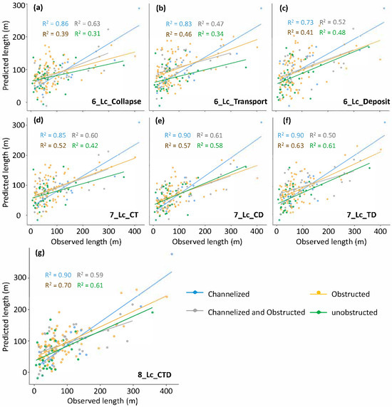 The multistage integration models (Model 7), combine variables from two landslide stages. In the CT models, the highest R2 was achieved by combining collapse length with environmental variables (R2 = 0.35; Figure 7), followed by log-transformed variables and height (R2 = 0.32). In the CD models, predictive power increased substantially, with collapse length yielding the highest outcome (R2 = 0.44; Figure 8), while all other variables ranged between R2 = 0.42 and 0.43. A similar pattern was observed in the TD models, where length again achieved the best performance (R2 = 0.44; Figure 9). These results confirm that integrating environmental descriptors from multiple process zones enhances model accuracy, with collapse length (Lc) consistently emerging as the strongest post-failure predictor. Among the multi-stage configurations, CD and TD models exhibited equally high and stable predictive performance, with all R2 values concentrated between 0.42 and 0.44.