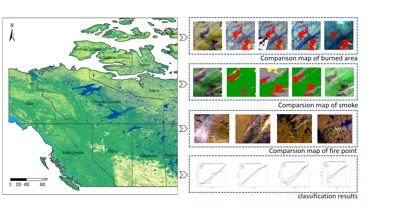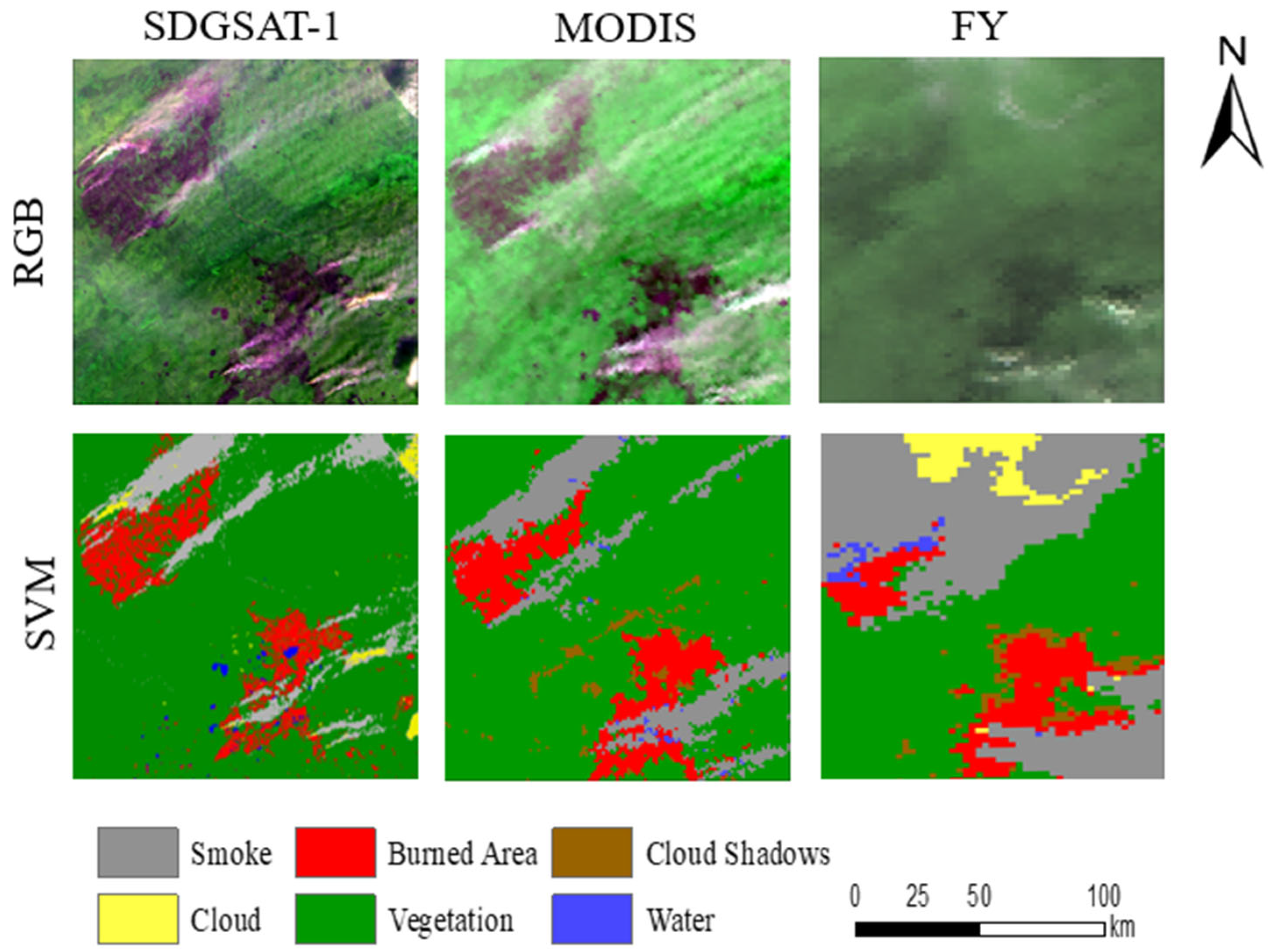- SDGSAT-1 is highly effective in extracting burned areas, providing clear fire bounda-ries with a higher precision of 95.46%, while the average accuracy of smoke detection is 81.72%.