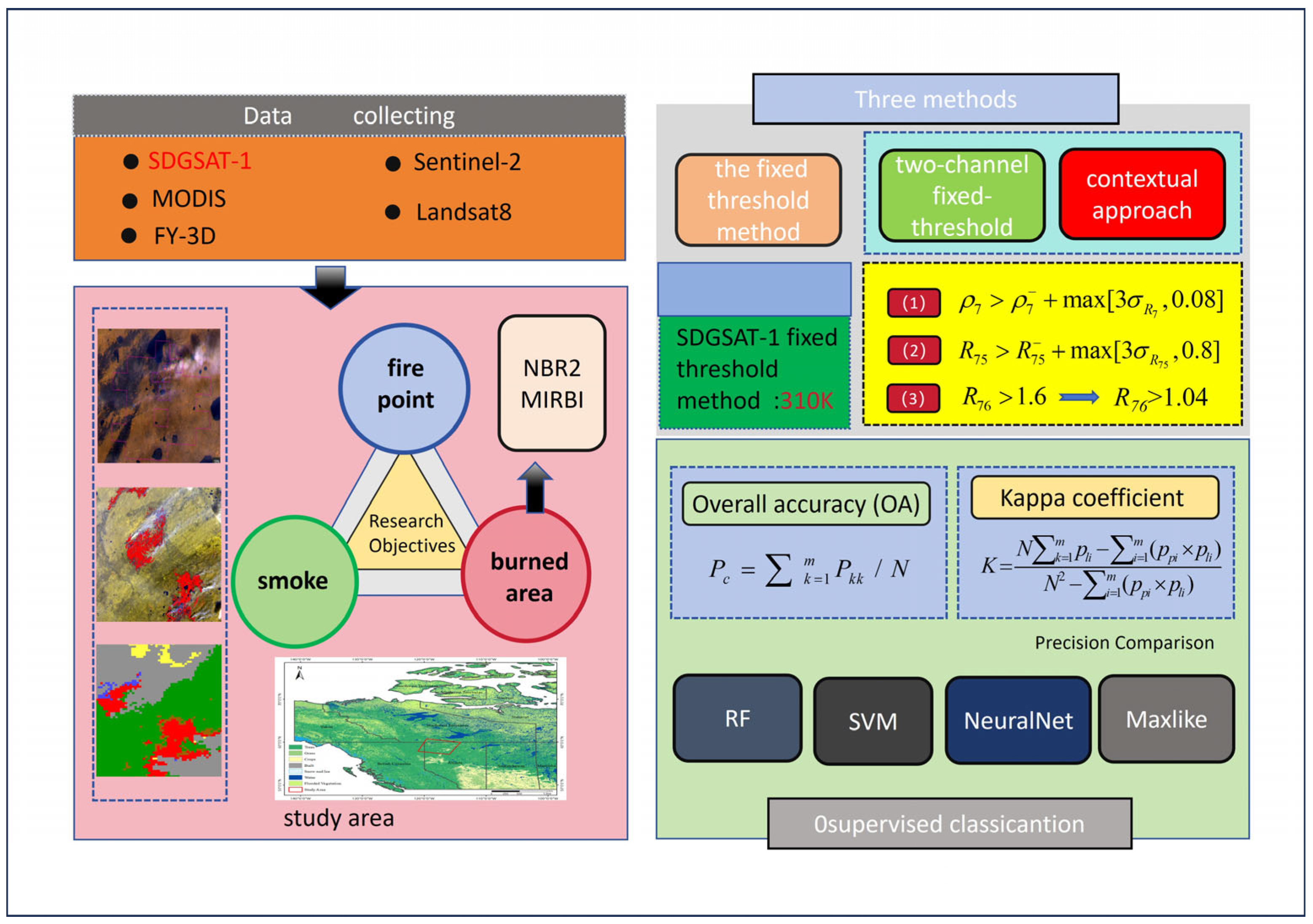 - Focusing on smoke, fire points and burned area as the research objective, explore the ability of SDGSAT-1 to detect wildfire.