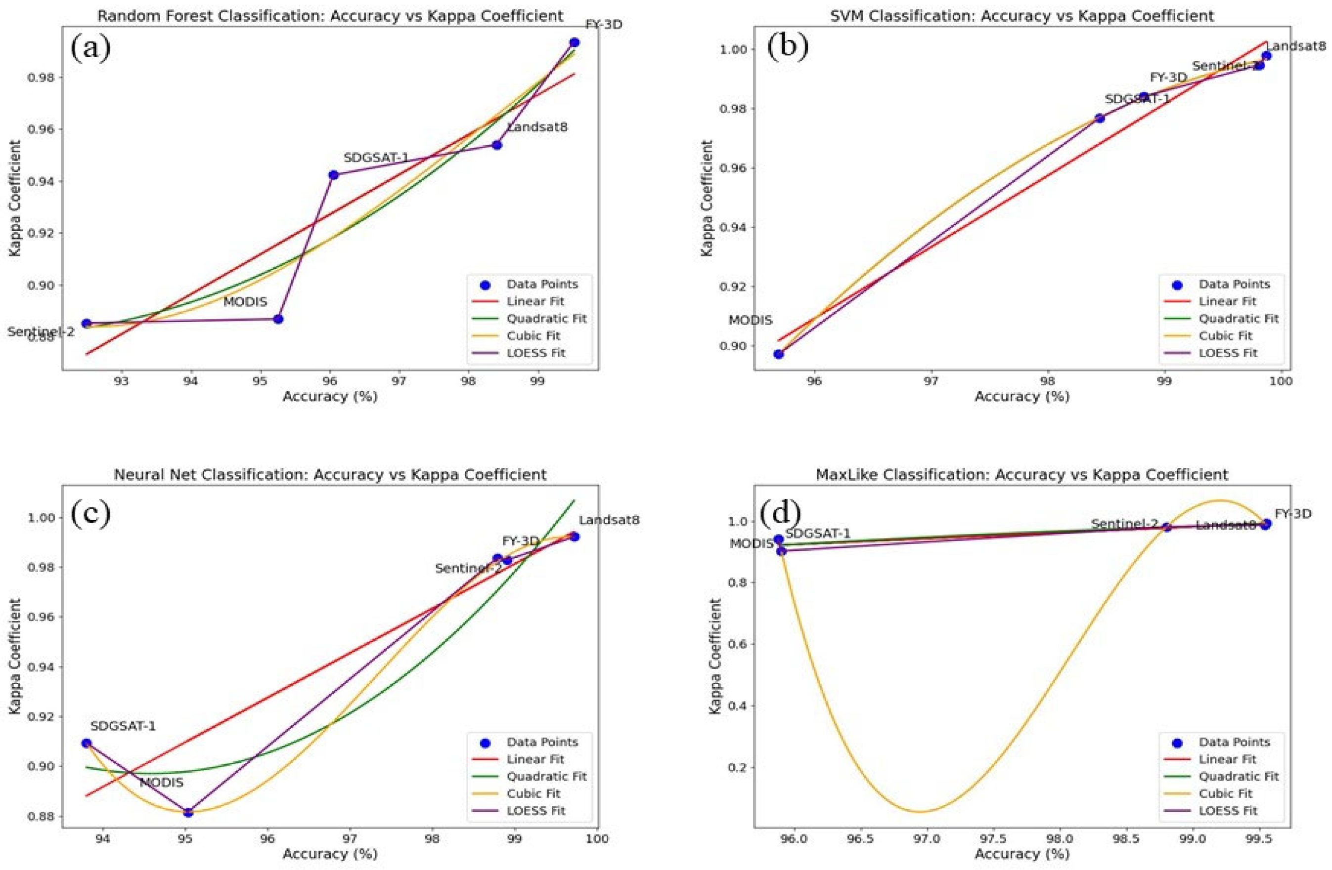 Accuracy | SDGSAT/ Sentinel-2 (%) | SDGSAT/ Landsat8 (%) | SDGSAT/ MODIS (%) | SDGSAT/ FY-3D (%) |