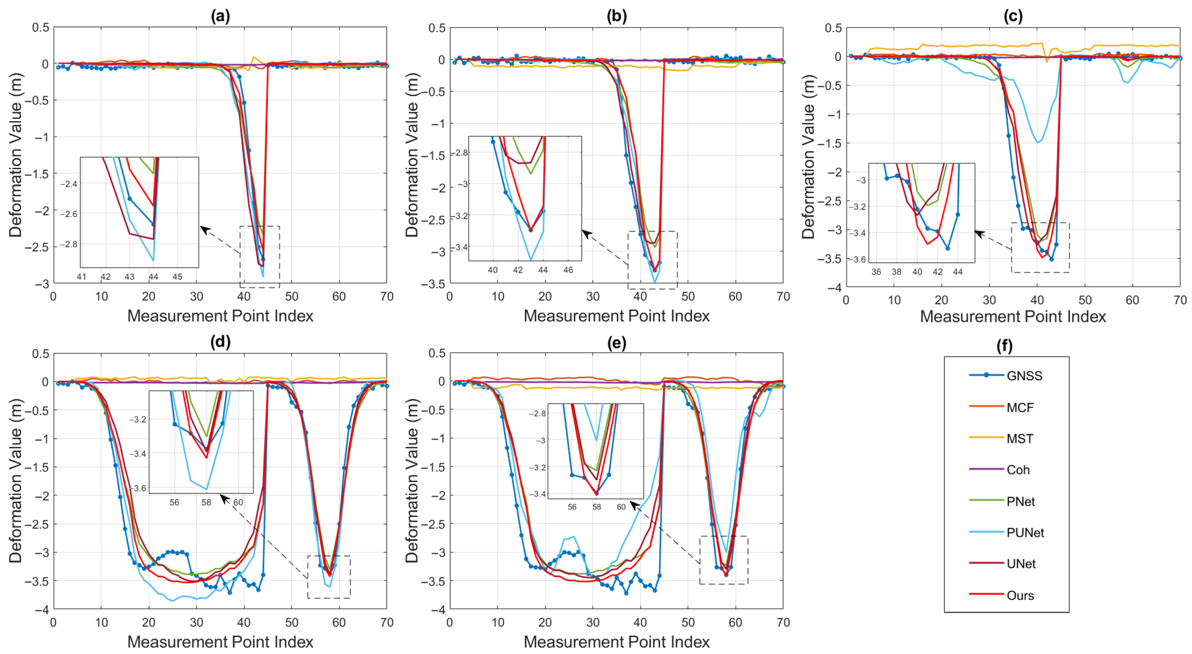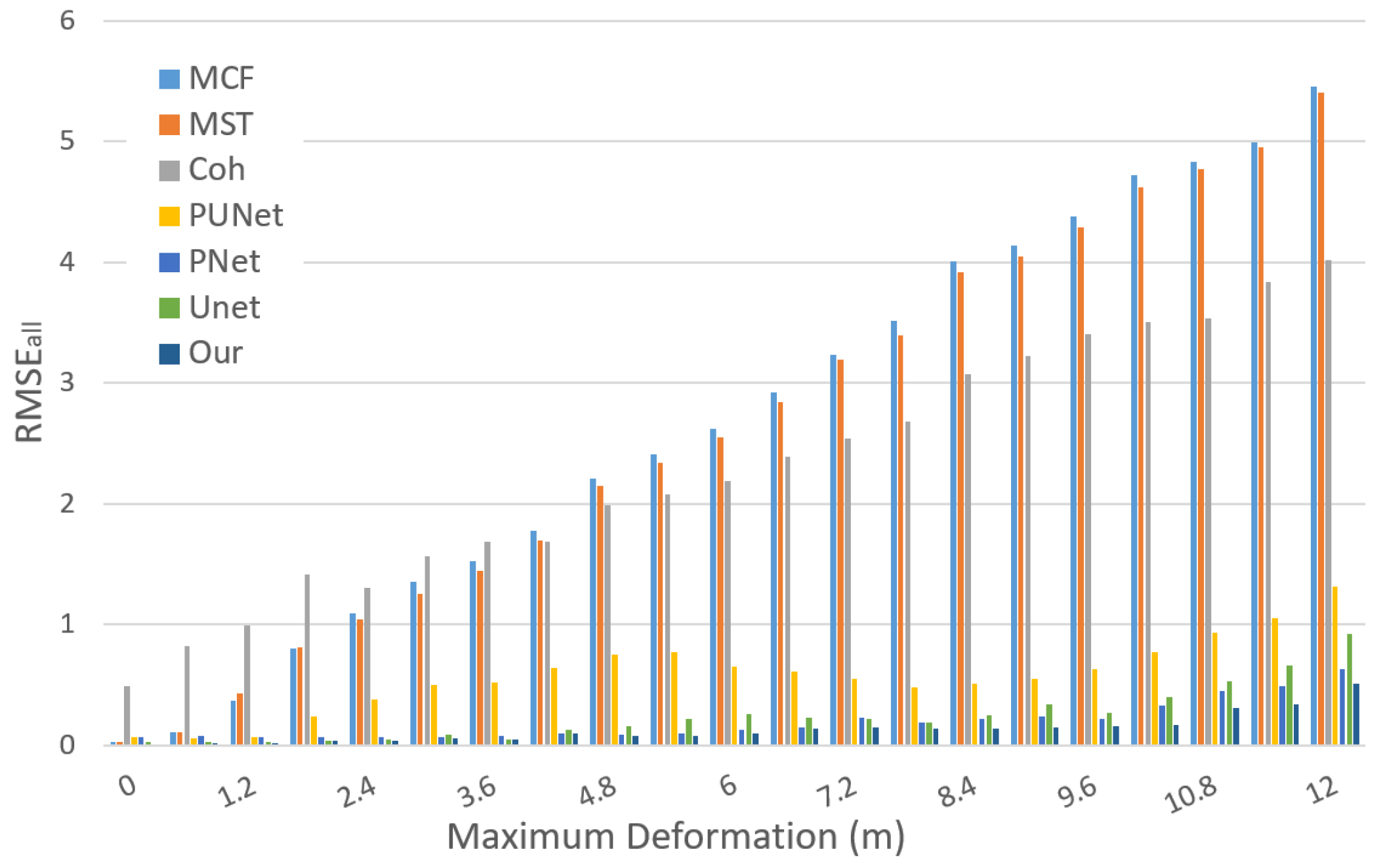 - Wu, Z.; Wang, T.; Wang, Y.; Wang, R.; Ge, D. Deep Learning for the Detection and Phase Unwrapping of Mining-Induced Deformation in Large-Scale Interferograms. IEEE Trans. Geosci. Remote Sens. 2021, 60, 1–18. [Google Scholar] [CrossRef]