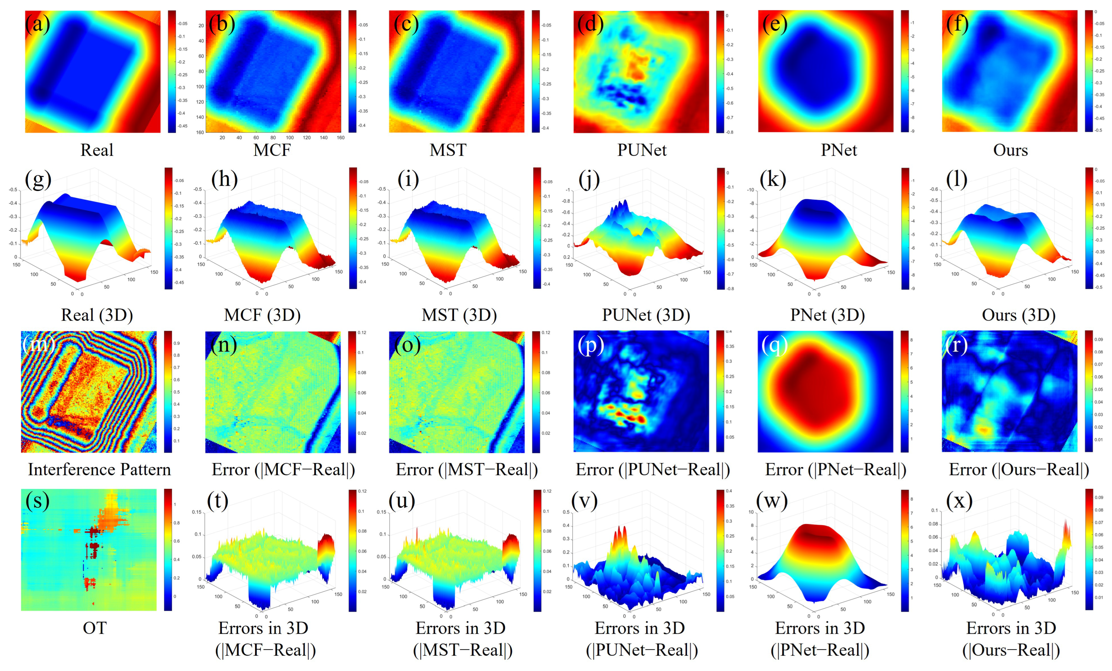 - Zhao, J.; Liu, L.; Wang, T.; Wang, X.; Du, X.; Hao, R.; Liu, J.; Liu, Y.; Zhang, J. VDE-Net: A Two-Stage Deep Learning Method for Phase Unwrapping. Opt. Express 2022, 30, 39794–39815. [Google Scholar] [CrossRef]