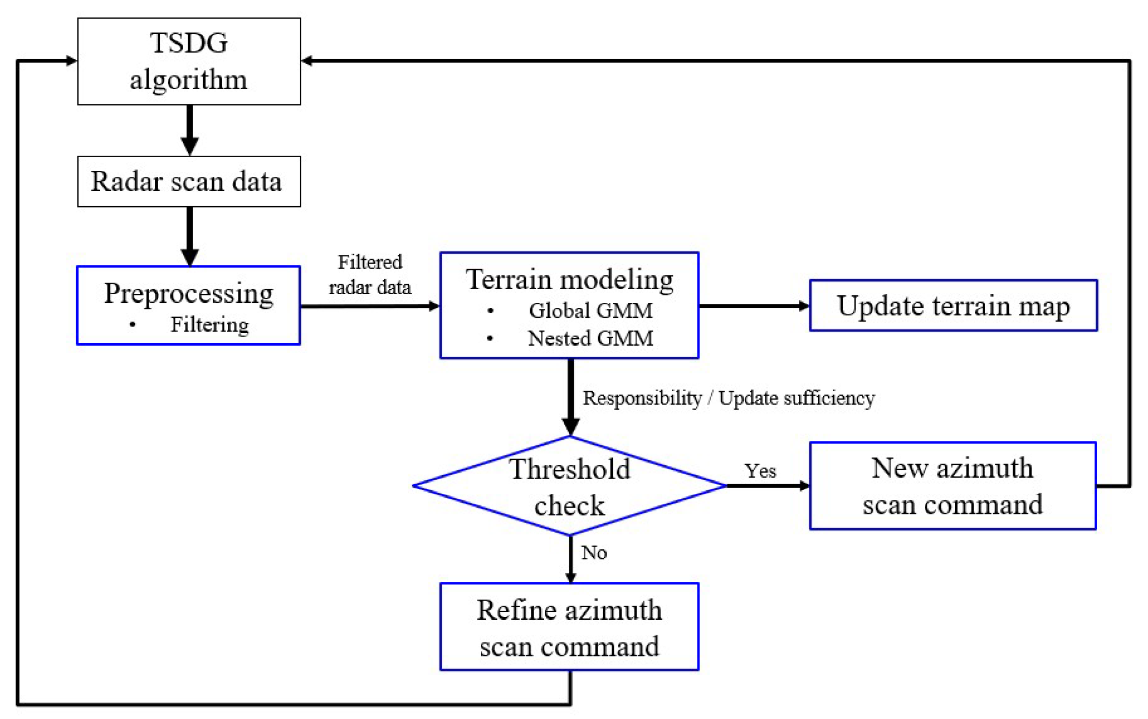 14]. They do not support real-time azimuth scan command adjustment or integration with radar-based terrain mapping. Recent extensions have attempted to improve the efficiency of GP-based mapping, such as multi-modal map building frameworks integrating SLAM with GP modeling [