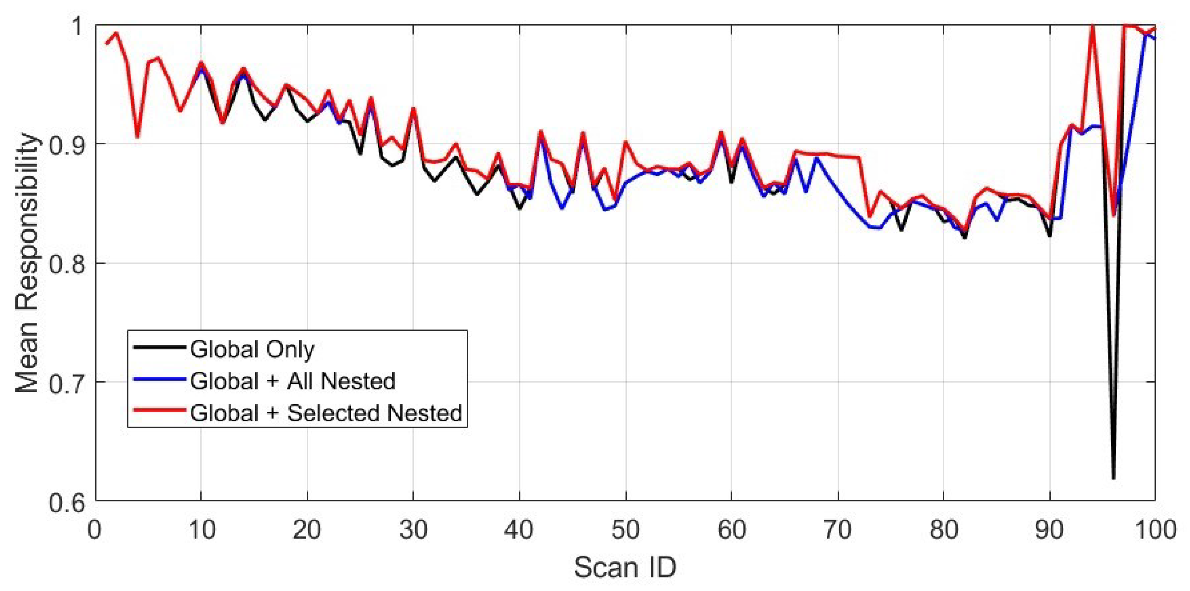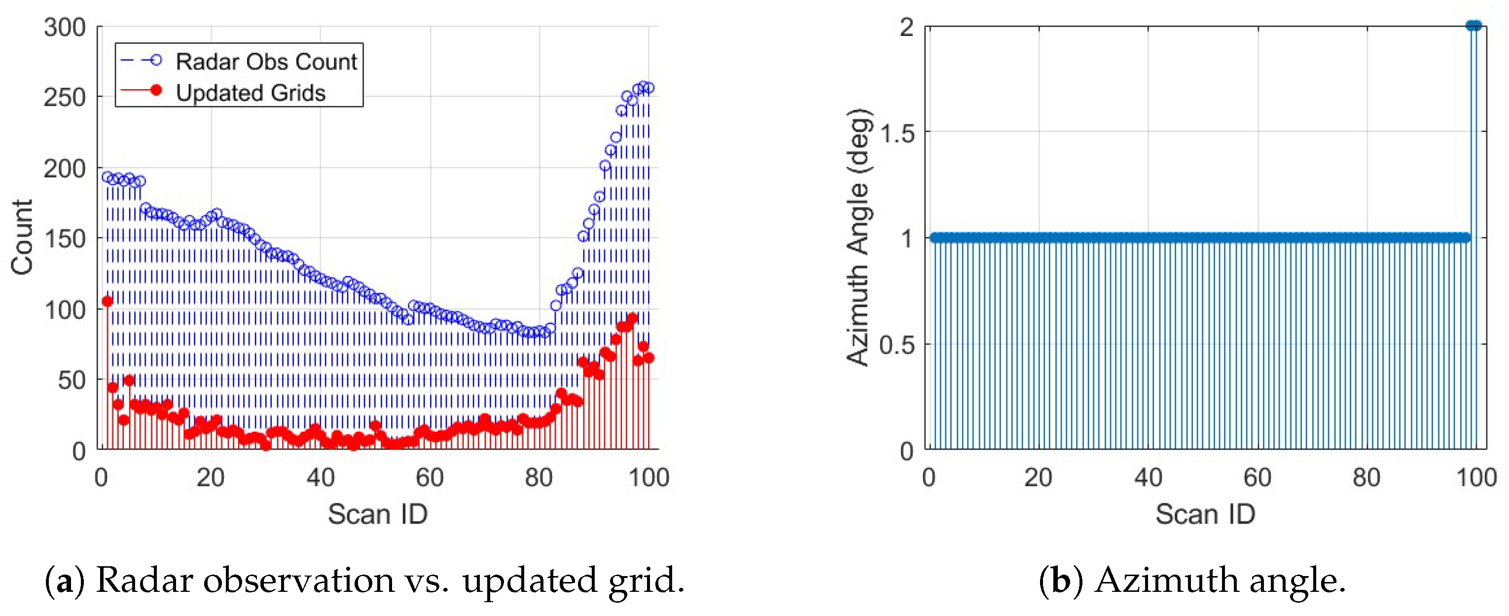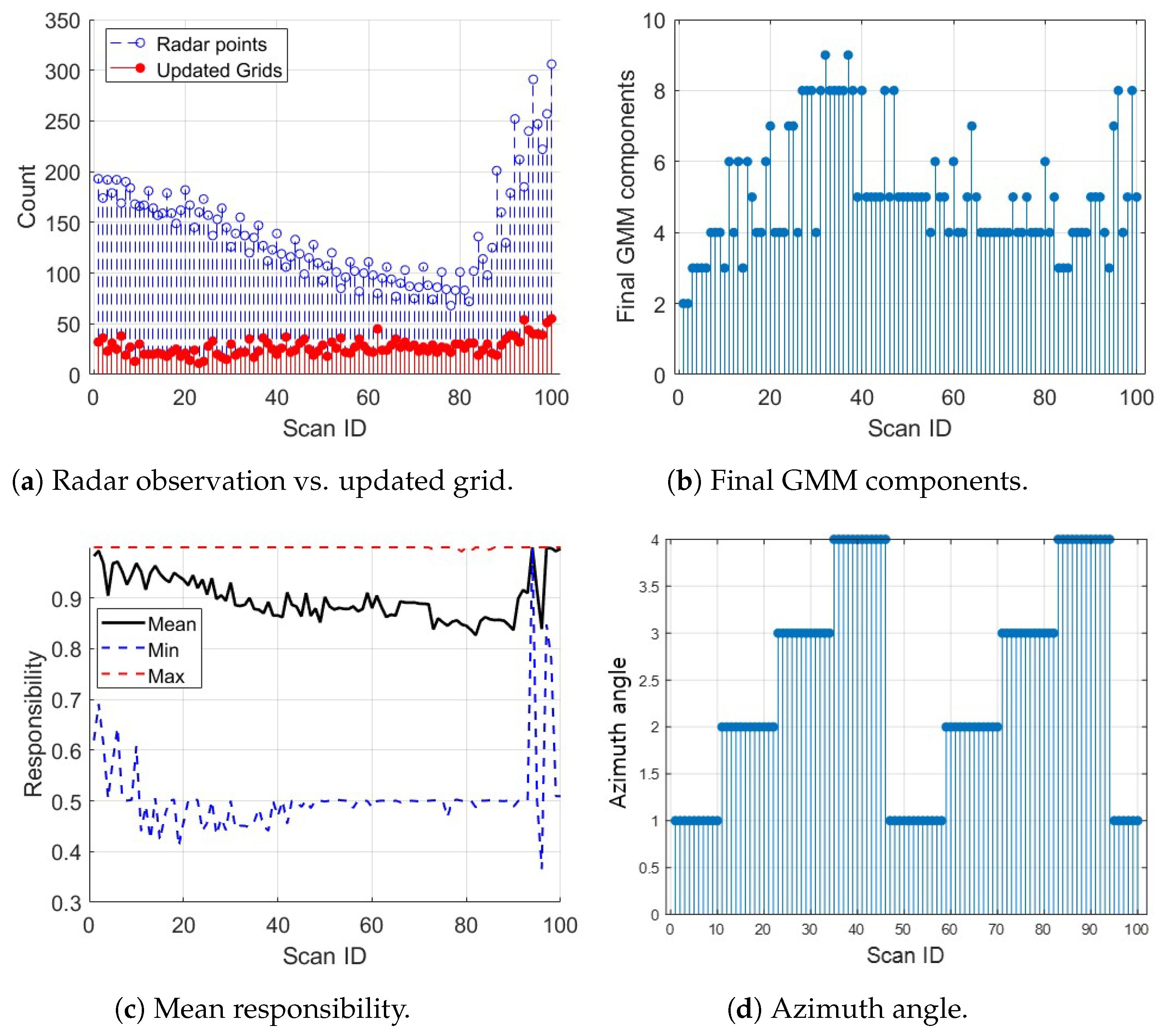 23], supporting compact probabilistic representations. However, in most existing approaches, posterior responsibility is often treated as a clustering metric or as a weighting factor in data fusion. In contrast, the proposed method uses posterior responsibility to control both grid updates and azimuth scan commands in a feedback loop.