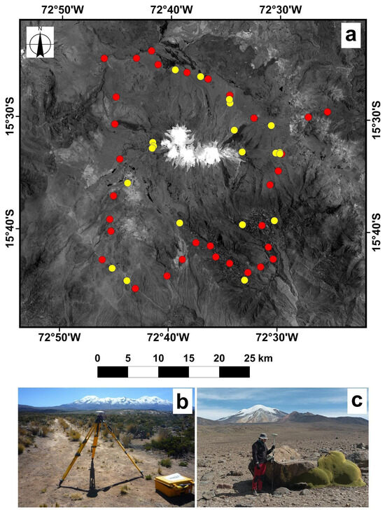 (a) Distribution of orthorectification (red) and validation (yellow) points around the Nevado Coropuna icefield. (b) Measurement of control points with the Trimble R6 GNSS using the static method. (c) (left) Measurement of control points with the Leica GPS1200 using the RTK method. GPS points shown in (b,c) are located southwest and east of Nevado Coropuna, respectively.