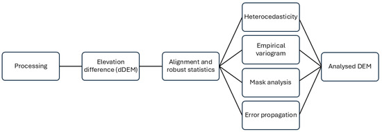 Elevations are retrieved from a series of measurements, such as image grids and ground trajectories, which are related to spatial support, horizontal georeferencing, and height independence. These aspects make the concept of accuracy complex, requiring statistical analysis to estimate precision, perform model uncertainty propagation, and assess consistency. The xDEM tool [32], an open-source Python 3.9.7 package [33] for DEM analysis which includes alignment, correction, and DEM uncertainty analysis, was used to evaluate the variable vertical precision and the spatial correlation of errors that can occur at multiple spatial scales [33]. The following workflow describes the analysis performed (Figure 5).