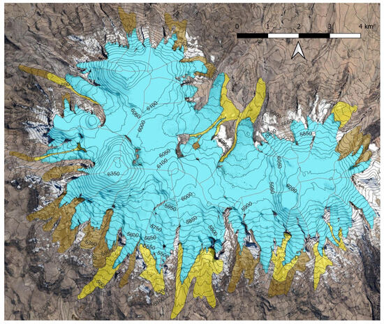 Glacier delimitation in Nevado Coropuna icecap. Blue polygons correspond to white glaciers, yellow polygons to debris-covered glaciers and brown polygons to rock glaciers. The contour interval is 50 m.