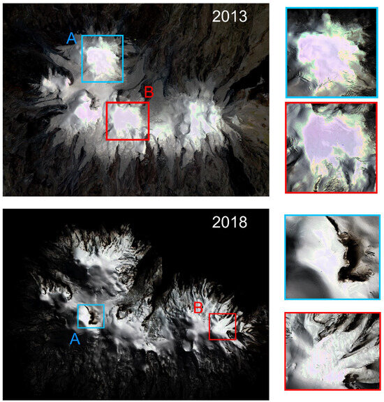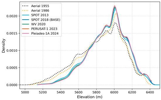 All satellite imagery-based DEMs used were masked to the most extensive glacier boundary, corresponding to the year 2013. This boundary was manually delineated through interpretation of the SPOT-6 image from that year. The boundary includes the white glacier as well as areas that, based on their appearance in the satellite image, are likely either active rock glaciers or debris-covered glaciers. Active rock glaciers were identified based on characteristic features such as sets of grooves and ridges transversal to the flow or an abrupt front [37]. Debris-covered glaciers were identified as debris areas with distinctive features such as ice cliffs or supraglacial ponds [38]. The goal is to capture the full extent of glacier mass loss. Rock glaciers and debris-covered glaciers were mapped separately from the white glacier. The error associated with pixel size at the glacier boundary is considered negligible, as the pixel size in the elevation difference (dh) raster DEMs is 2 m. Ice boundaries for the 1986 and 1955 images were also manually delineated through photointerpretation, but in these cases no debris-covered ice was identified due to the lack of detail and the amount of snow cover in both cases.