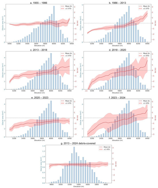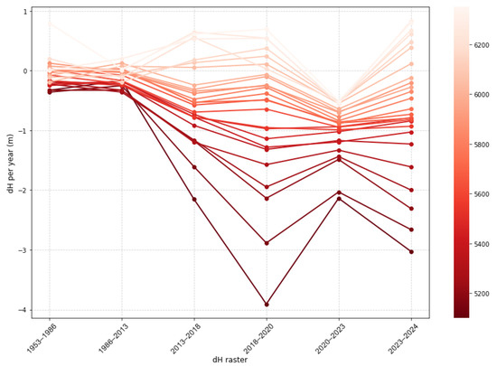 Evolution of annual dh at different elevation belts. Note that the horizontal axis is temporal, but not to scale.