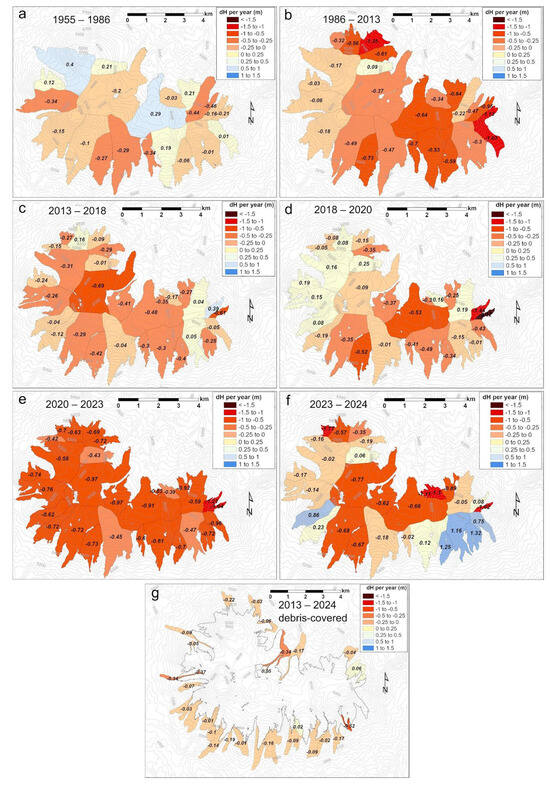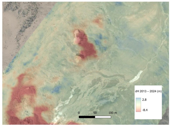 Debris-covered glaciers and rock glaciers are important and extensive features around Nevado Coropuna, with 23% of the total glaciated area in 2013, according to our limits mapping. Mass balance in debris-covered areas accounts, however, for 6.5–7% of the total mass loss in most cases, except the 2023–2024 season, in which the dh is positive for these areas. The behaviour of debris-covered ice differs from the accelerating trend mentioned, with a slightly negative dh which is nevertheless not uniform, but more clearly negative around supraglacial ponds and ice cliffs in debris-covered glaciers, and almost even in rock glaciers (see Figure 15). This trend is like examples elsewhere in South America [10,53] or the Himalayas [56]. This result points out the importance of buried frozen water as a long-lasting resource in the current context of warming climate. This idea is even more powerful if we consider that deglaciation will likely enhance rockfall and other events related to slope instability, potentially extending the debris-covered glacier and rock glacier areas, in the near future.