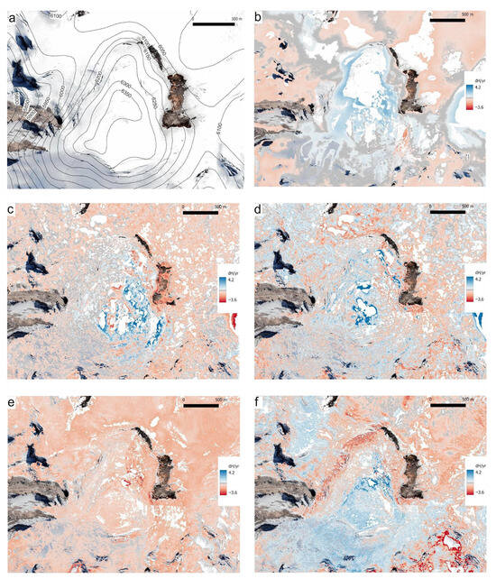 Images show dh at the southwestern peak and crater area. (a). Image from Google Satellite. (b). dh 1986–2013. (c). dh 2013–2018. (d). dh 2018–2020. (e). dh 2020–2023. (f). dh 2023–2024. White areas correspond to pixels whose values were considered outliers according to the methods explained in Section 3.9.