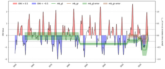 Nevado Coropuna mass balance and ENSO. Source of ENSO Oceanic Niño Index (ONI) data: https://psl.noaa.gov/data/correlation/oni.data (accessed on 1 July 2025).