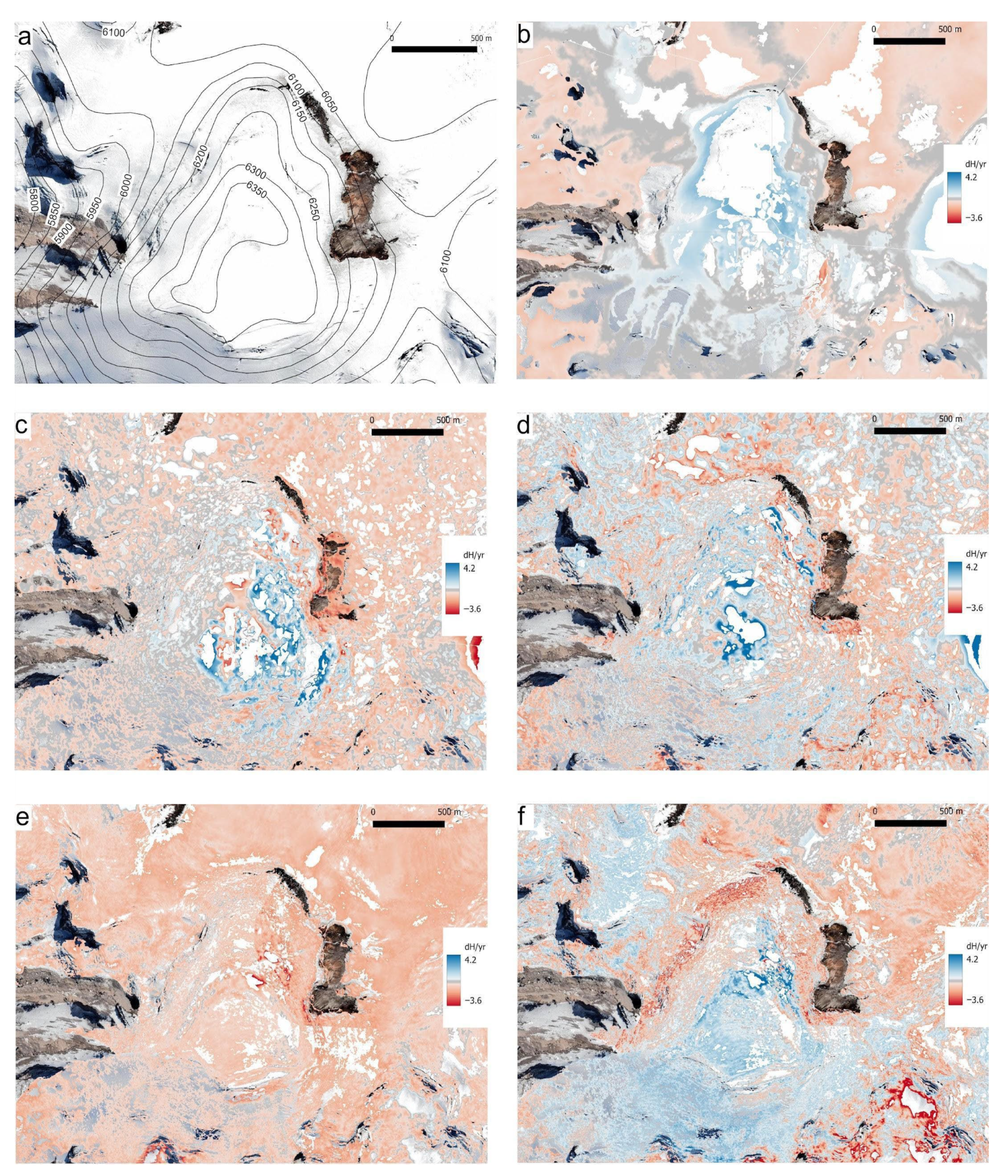 - Peduzzi, P.; Herold, C.; Silverio, W. Assessing high altitude glacier thickness, volume and area changes using field, GIS and remote sensing techniques: The case of Nevado Coropuna (Peru). Cryosphere 2010, 4, 313–323. [Google Scholar] [CrossRef]