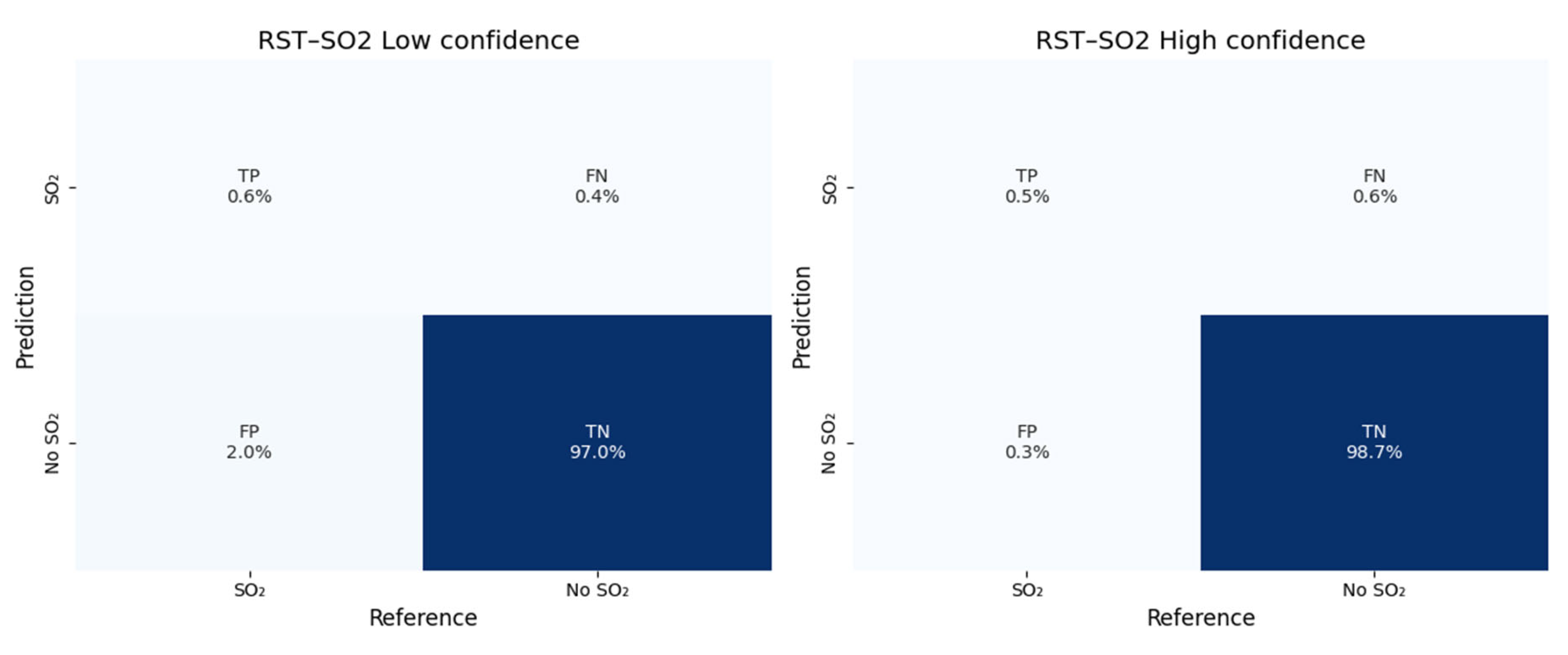 - True Negative (TN): The number of pixels correctly identified as not containing SO2.