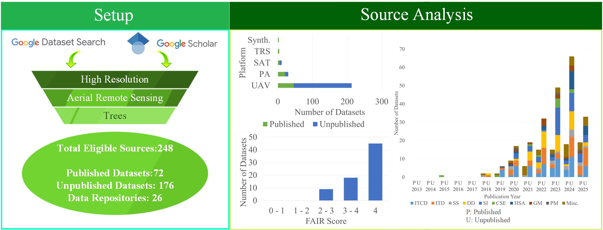 - There are more unpublished data than published: The visible imbalance between the amount of published and unpublished data uncovered through our study underscores a challenge in forestry-related remote sensing datasets. It becomes evident that a substantial amount of valuable data remains unshared, inaccessible to the wider research community. While the past years have witnessed a growth in the publication of forestry-related remote sensing data, there remains a pressing need for increased efforts to motivate researchers to share their data openly. The prevalence of unpublished data suggests untapped potential and unexplored possibilities for advancing forestry, robotics, and computer vision research. Initiatives promoting data sharing, fostering collaborative platforms, and highlighting the benefits of open data practices are essential to bridge this gap. Encouraging a culture of data transparency and openness is crucial to harness the full potential of available datasets, fostering innovation and contributing to a more comprehensive understanding of forest ecosystems.