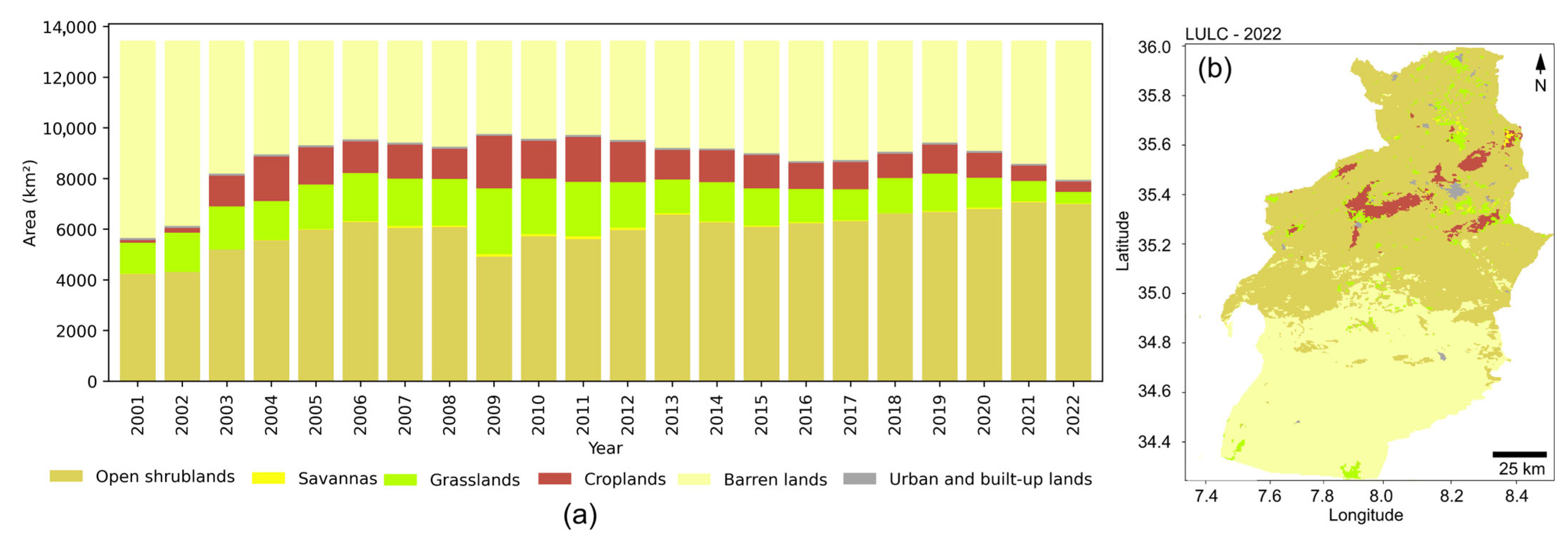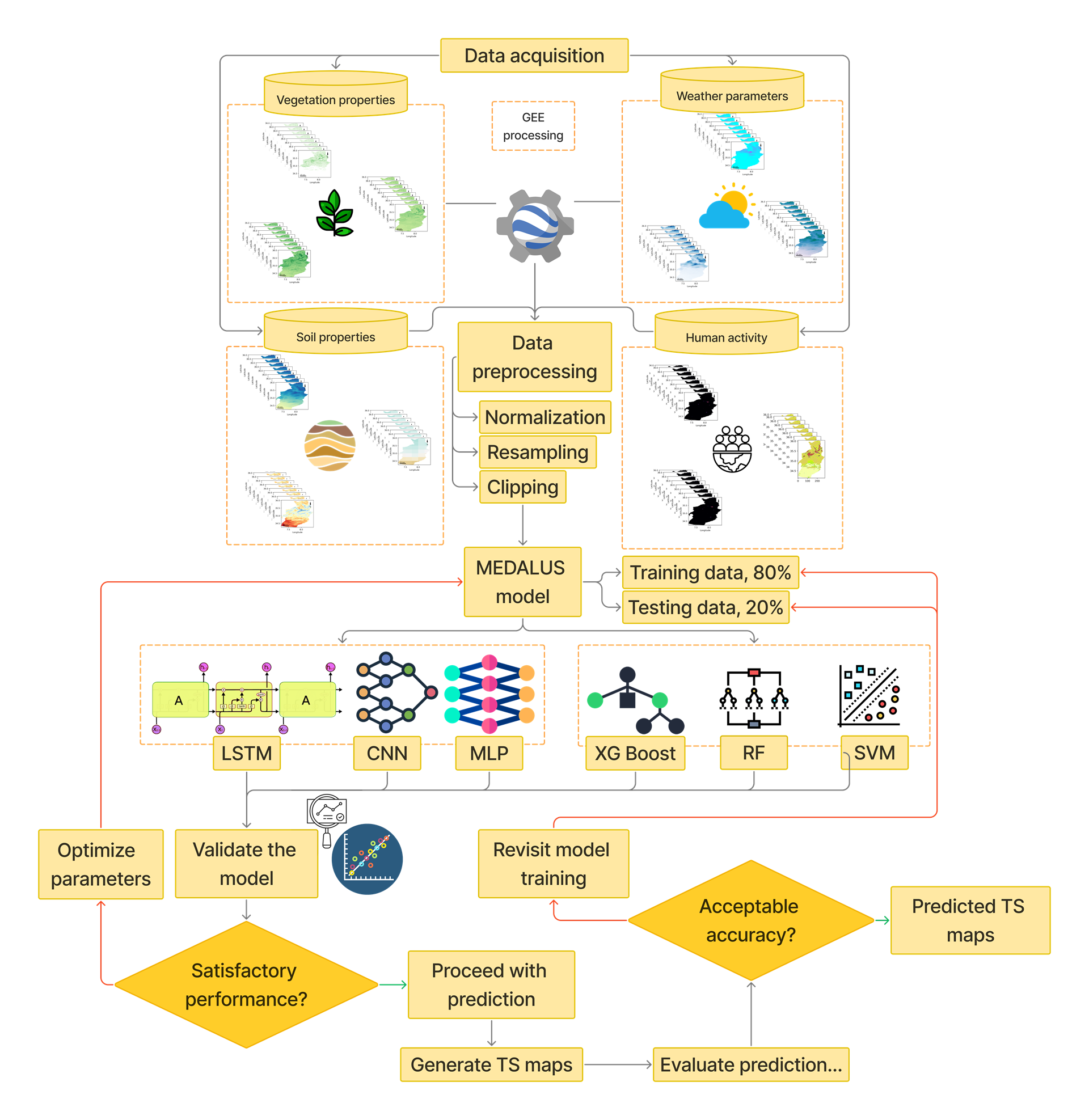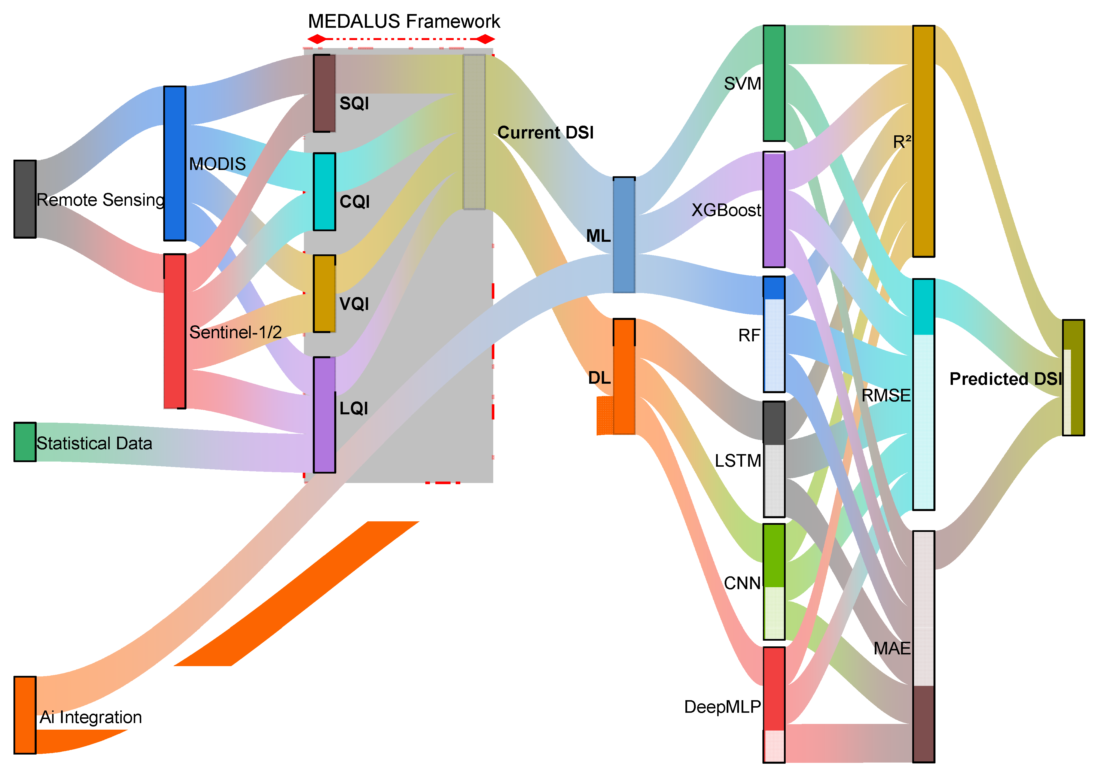 | This study | MODIS, Sentinel-1/-2, Weather in atmosphere and land parameters; MEDALUS in GEE and Python for temporal prediction. | Almost three-decade-long analysis (2001–2028). Spatio-temporal prediction. Machine and deep learning models enhance predictive accuracy. MEDALUS flexible implementation and robust Geo-AI integration. | Not all socio-economic or land management factors were considered. DL models require tuning and interpretability efforts. |