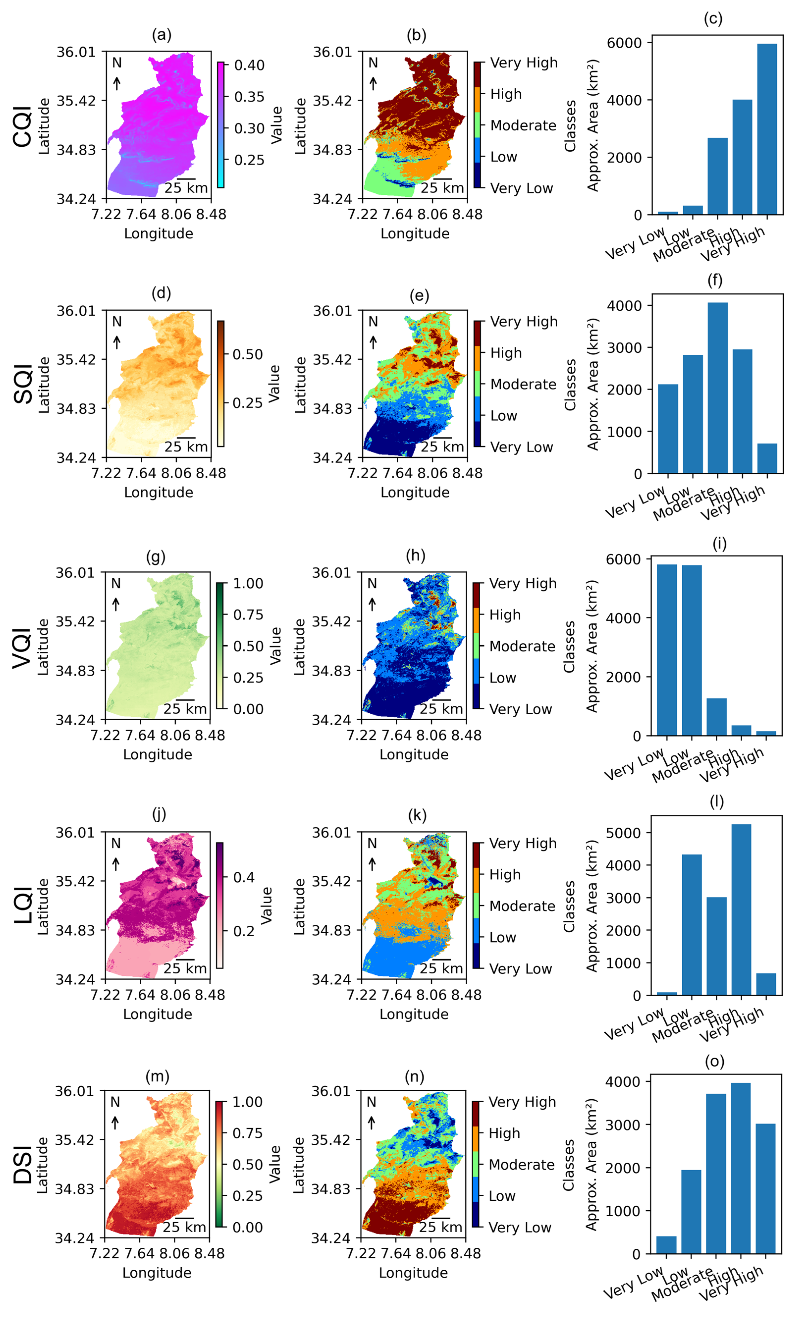 | 0.81–1.0 | Very High | Very high | Highly susceptible to desertification, with extreme conditions of soil degradation, low vegetation, and poor climate resilience. |