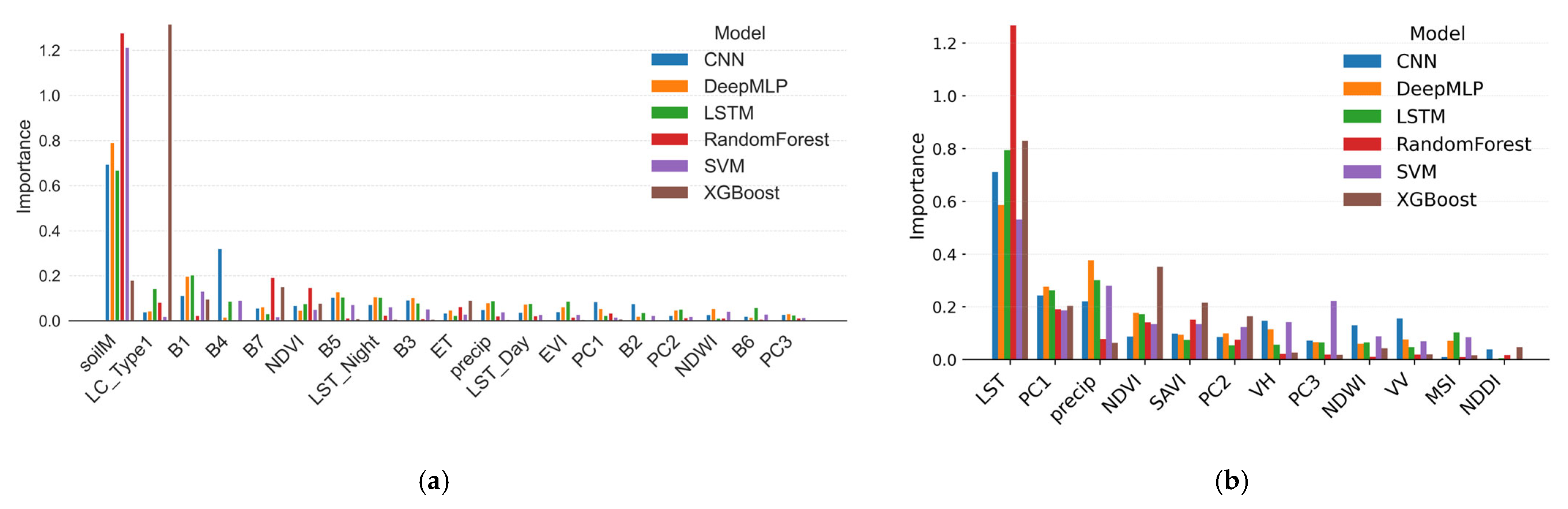 3.3.2. Feature Importance Analysis for DSI Prediction Using MODIS and Sentinel Data