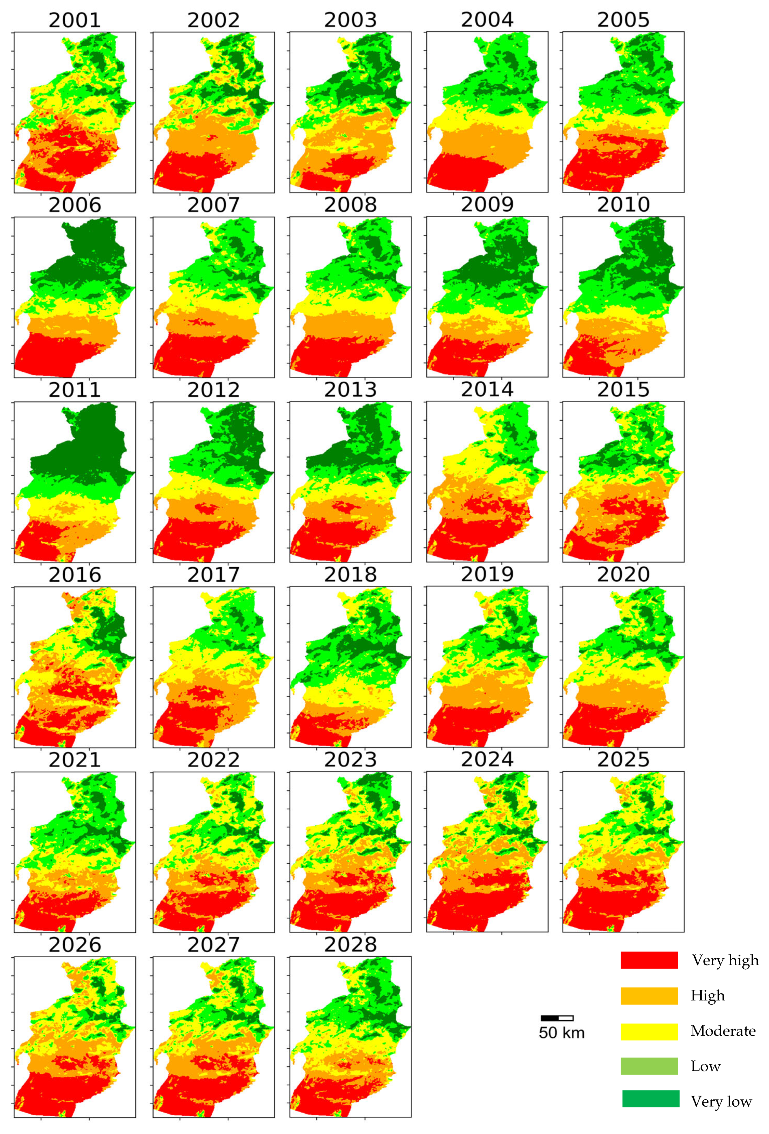 3.4. DSI Annual Spatial Variations from 2001 to 2028